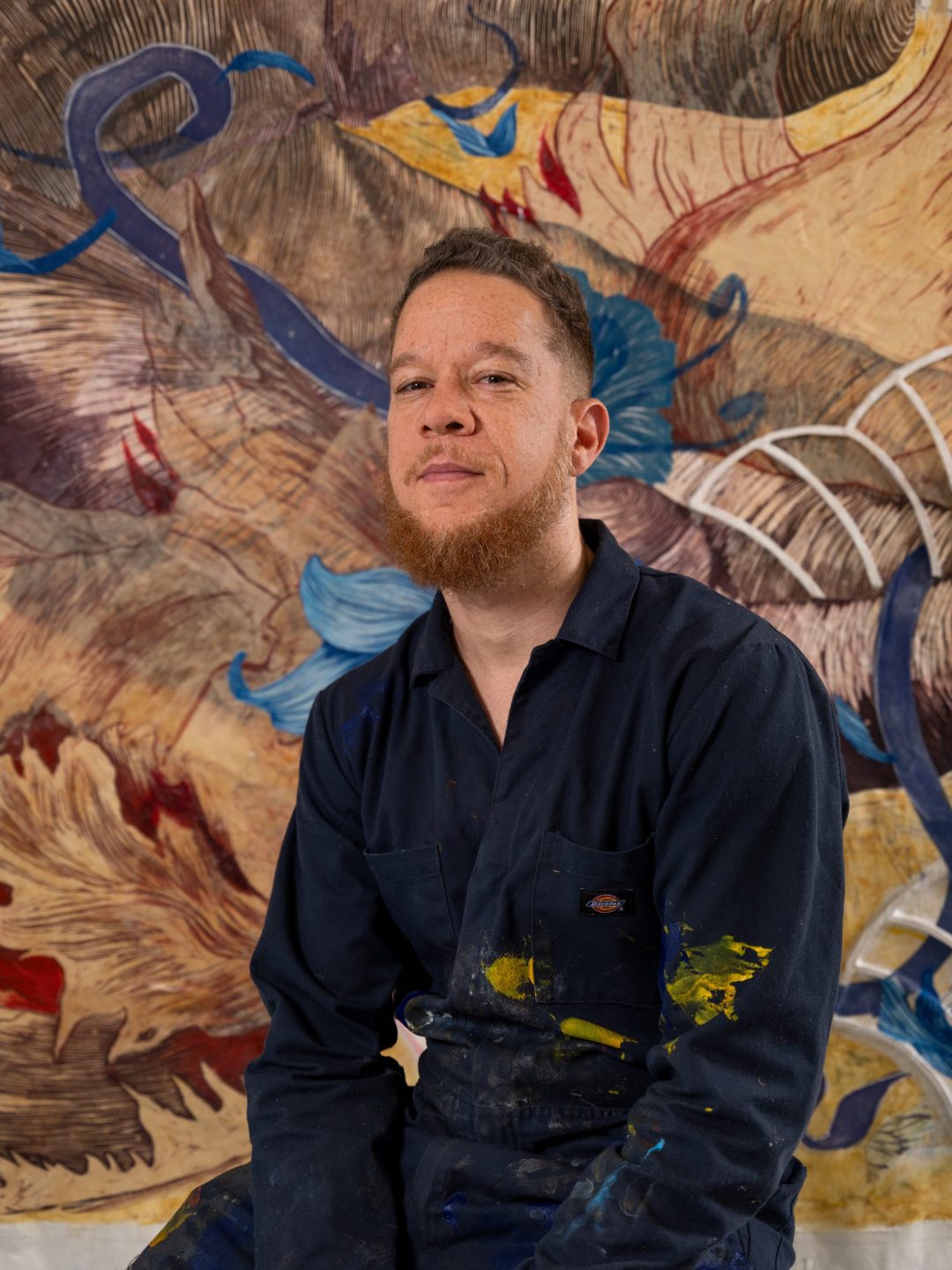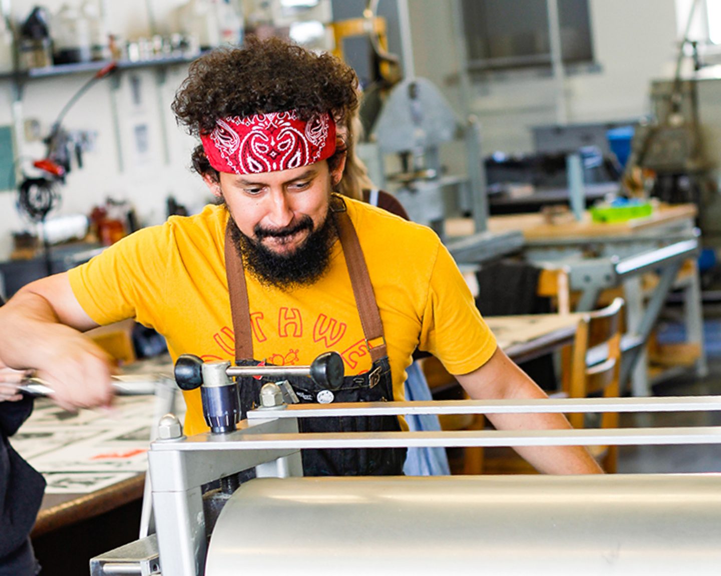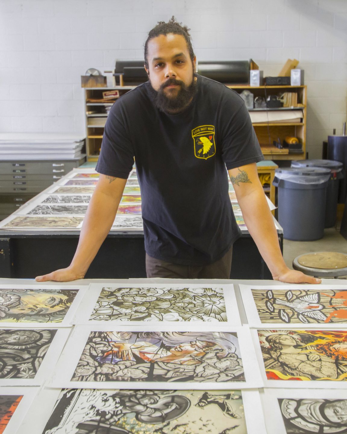 Derick Wycherly (Chippewa Cree) is an artist and collaborative printmaker from Montana. Derick received a BFA from the Rhode Island School of Design in 2011, then worked at the esteemed print workshop, Harlan & Weaver, in New York until 2019. Derick is an Ed-Grs fellow and MFA candidate in Printmaking 2022 at the University of Wisconsin, Madison.