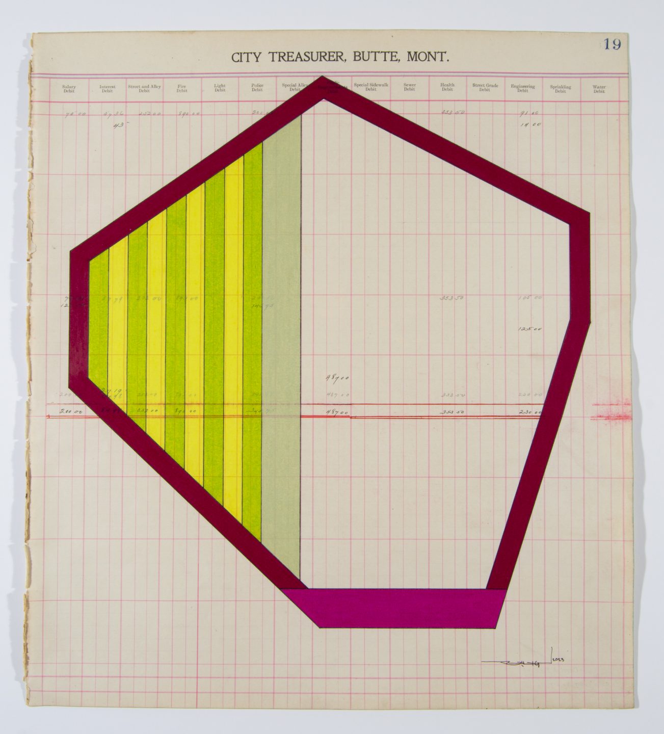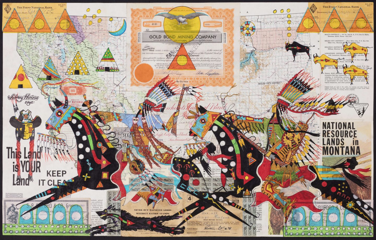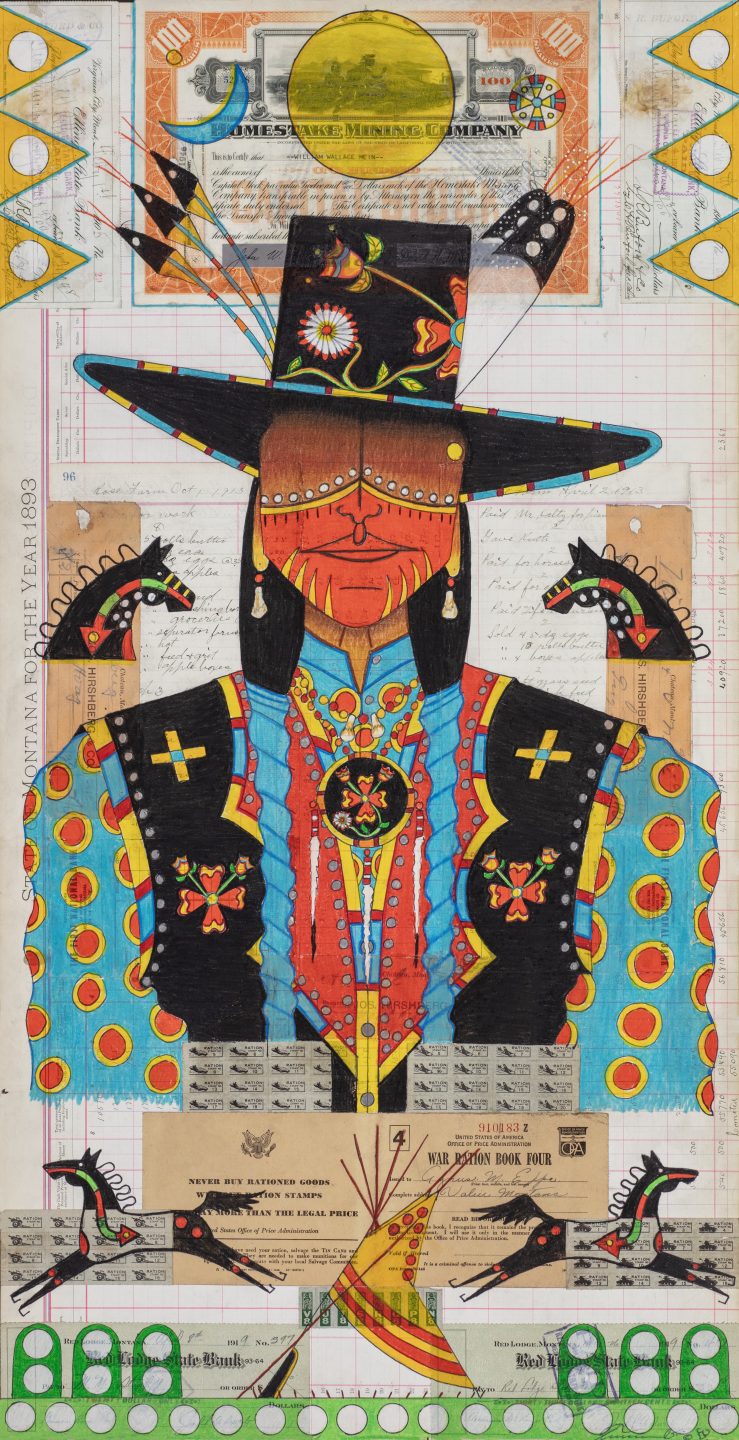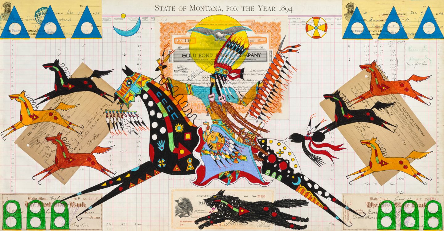 Terrance Guardipee is an internationally acclaimed Blackfeet painter and ledger artist, consistently recognized for the traditional depiction of his Blackfeet heritage and the contemporary innovation demonstrated in his work. Guardipee was one of the first Native artists to revive the historical ledger art tradition, and the first ledger artist to transform the style from the single-page custom into his signature map collage concept. The map collage concept is based on the ledger art style, but in addition to single-page ledgers he incorporates various antique documents such as maps, war rations, and checks. In all his artwork, Guardipee uses antique documents dating from the mid-19th century and typically originating from the historical and present Blackfeet homeland of Montana. Guardipee is an enrolled member of the Blackfeet Nation of Montana and illustrates his personal experience of Blackfeet culture in combination with his educational experience in his artwork. He was raised in the Blackfeet homeland in northern Montana, and as a result, the cultural life and history of the Blackfeet people became a foundational part of his identity. Moreover, he regularly participates in the traditional Blackfeet ceremonies often depicted in his artwork. Guardipee’s understanding and personal knowledge of authentic Blackfeet history and traditional culture is expressed in his work. He lived in Montana until he attended the Institute of American Indian Arts located in Santa Fe, New Mexico, where he studied two-dimensional arts. His educational experience at IAIA enabled him to incorporate the contemporary color palette he is known for in a manner that is consistent with Blackfeet tradition.