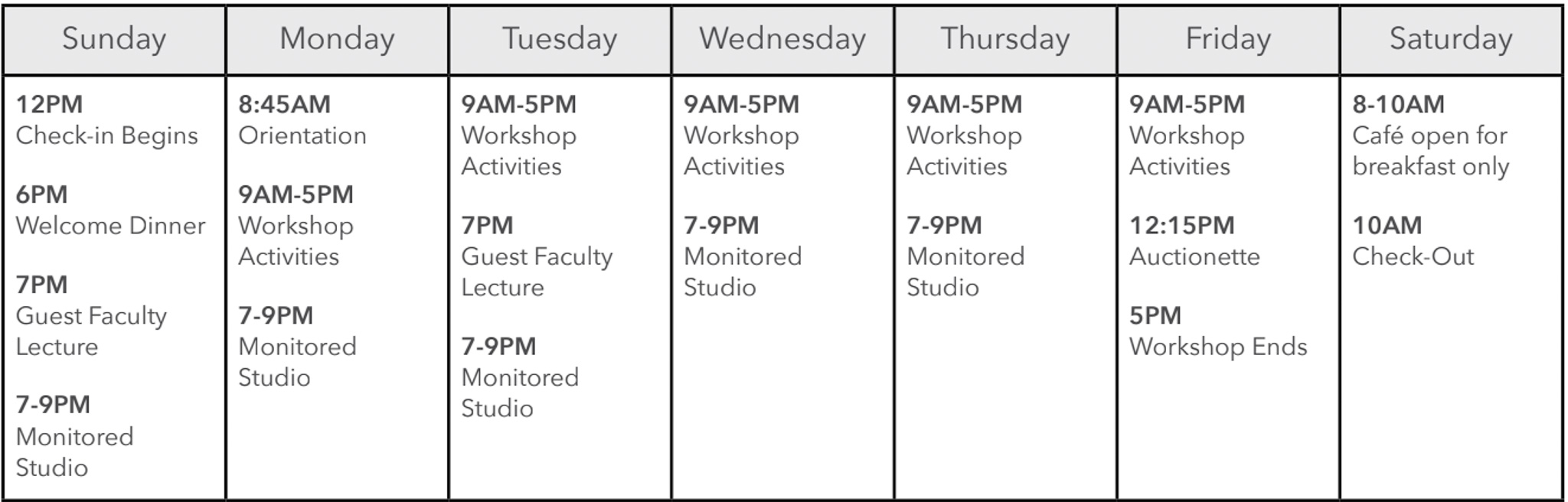 On the first Monday morning, there will be a short general orientation in the Schermer Meeting Hall at 8:45 a.m. We encourage all participants to attend as important announcements are made, and winter program instructors and Anderson Ranch staff are introduced.